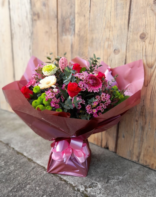 A beautiful hand tied selection of pastel coloured Roses, Germini, Wax Flower, Chrysanthemum and Eucalyptus presented in a glass vase.